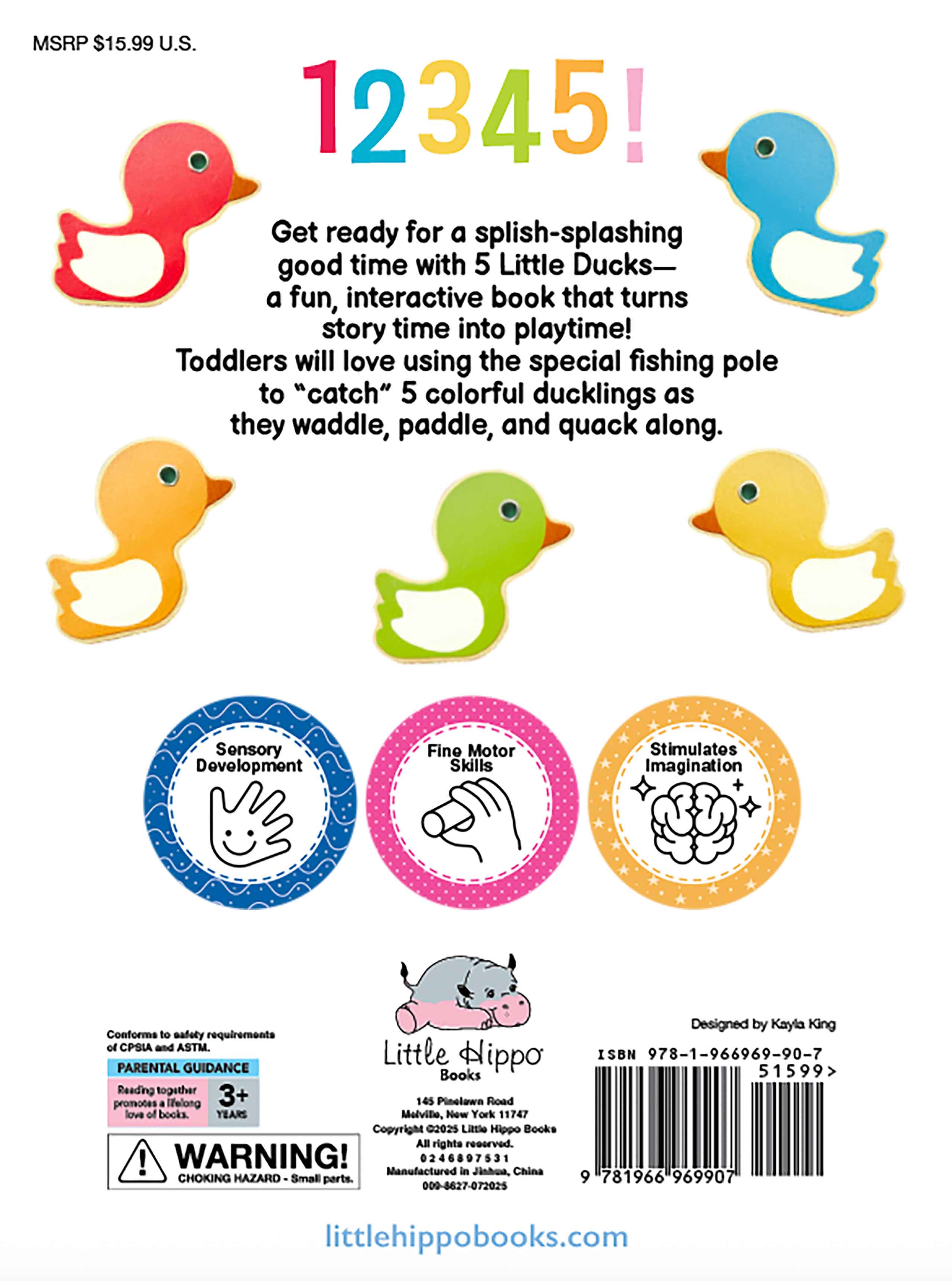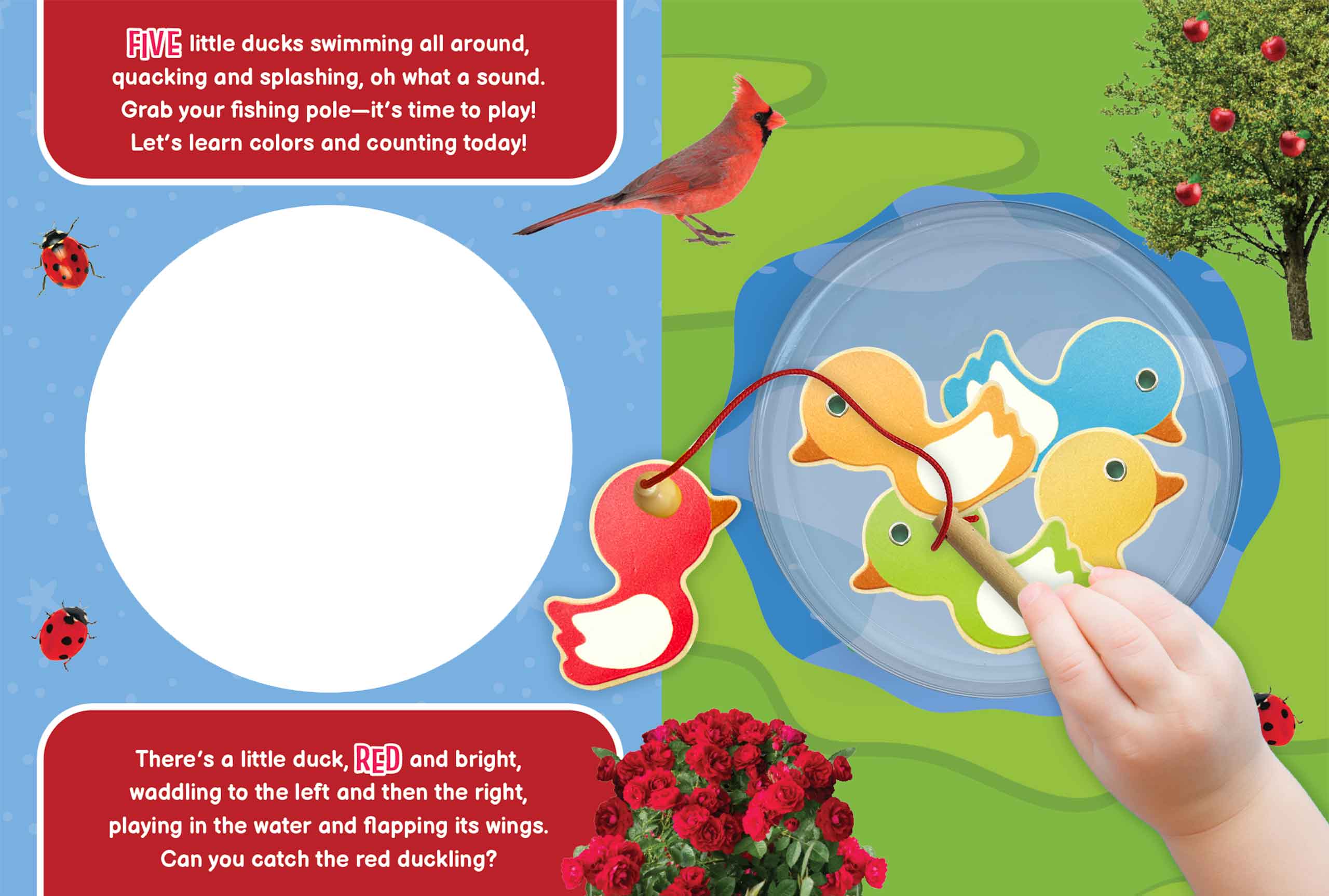 Get ready for a splish-splashing good time with 5 Little Ducks — a fun, interactive book that turns story time into playtime! Toddlers will love using the special fishing pole to “catch” 5 colorful ducklings as they waddle, paddle, and quack along.