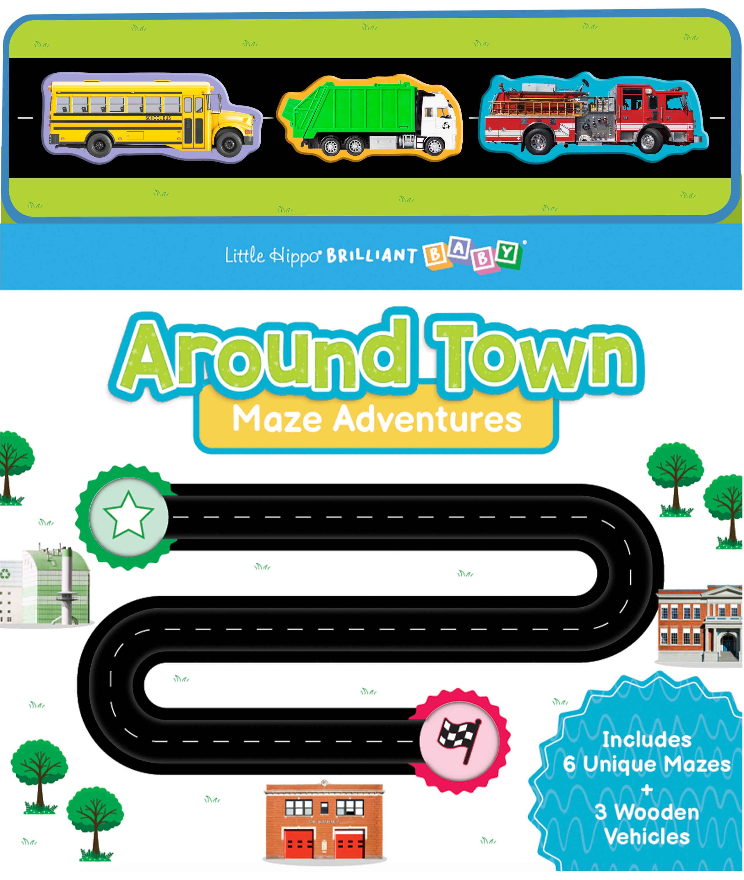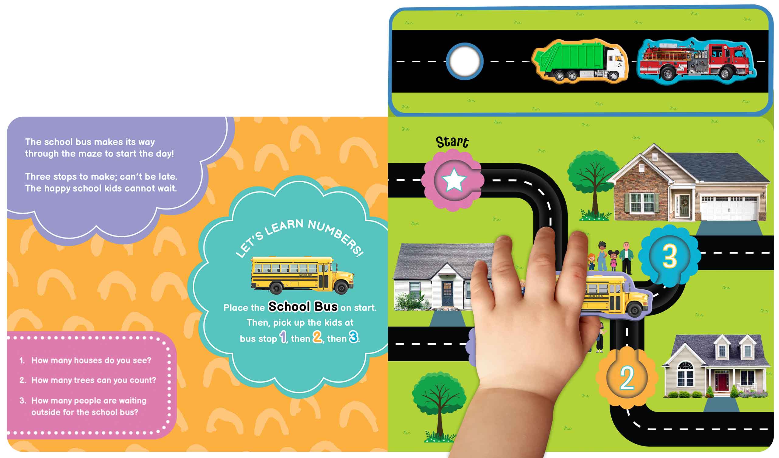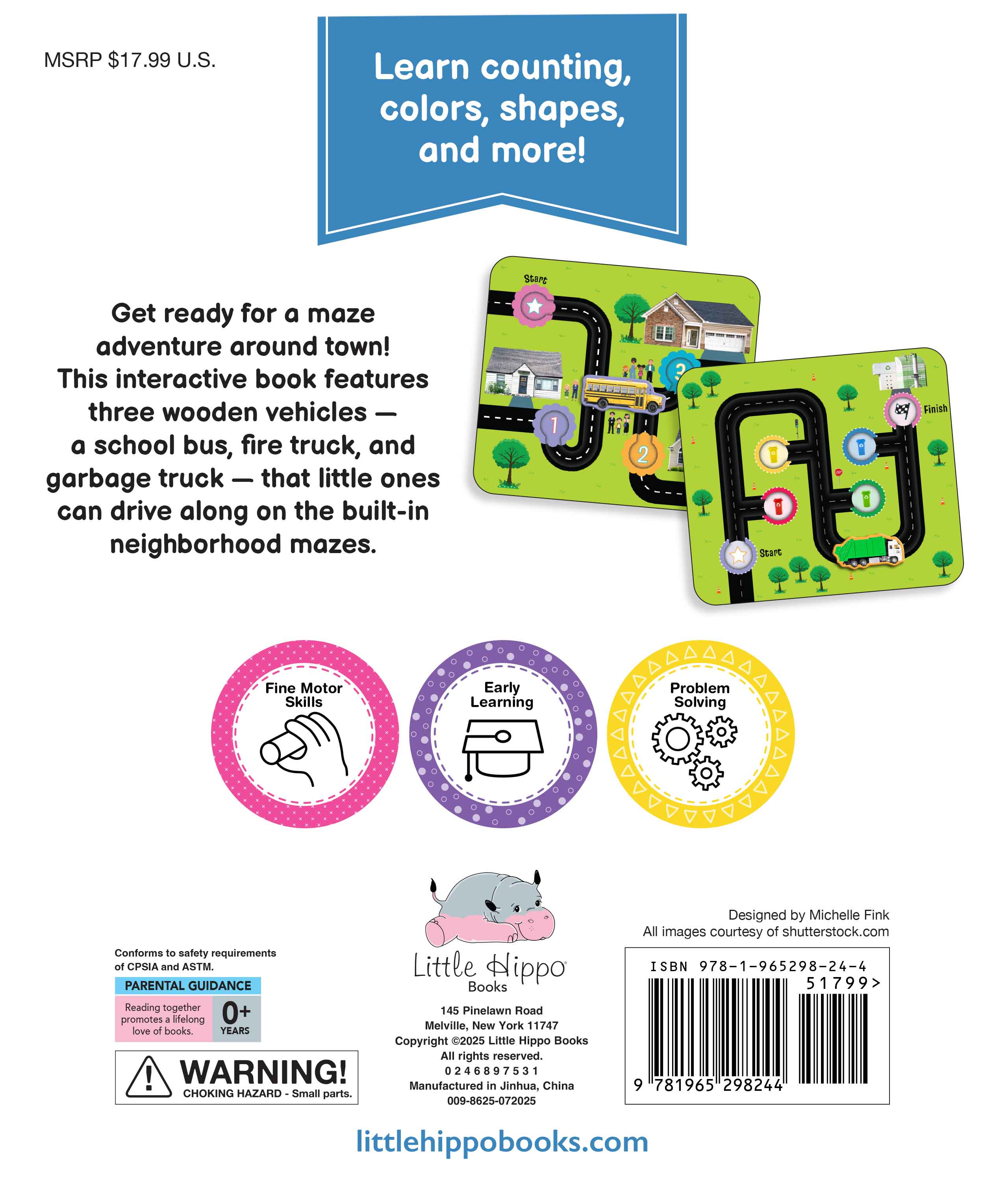 Get ready for a maze adventure around town! This interactive book features three wooden vehicles — a school bus, fire truck, and garbage truck — that little ones can drive along on the built-in neighborhood mazes.