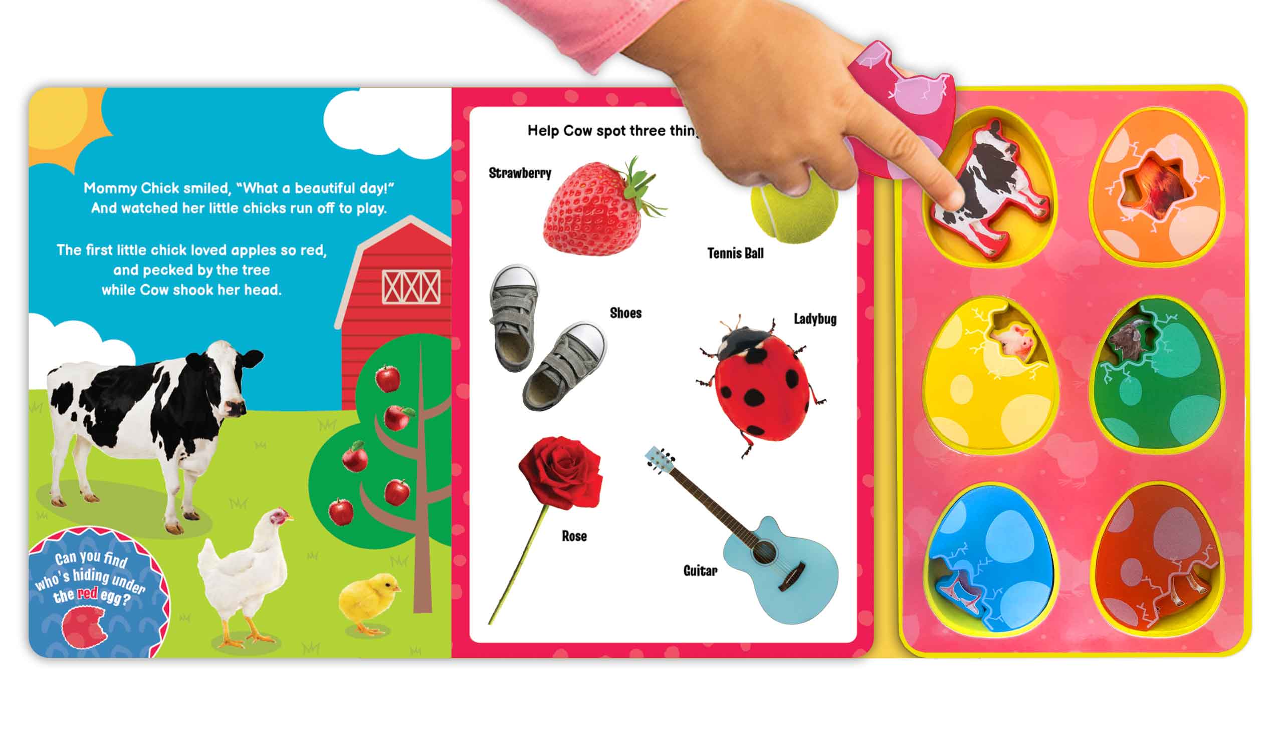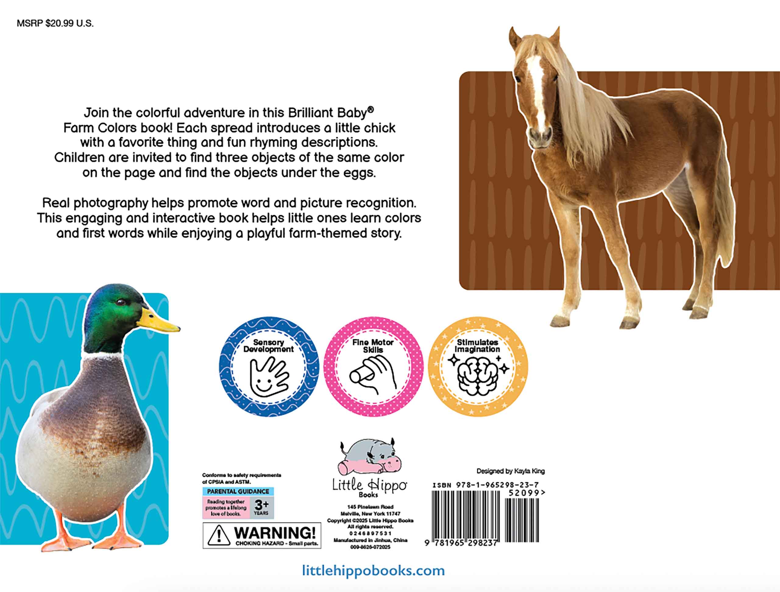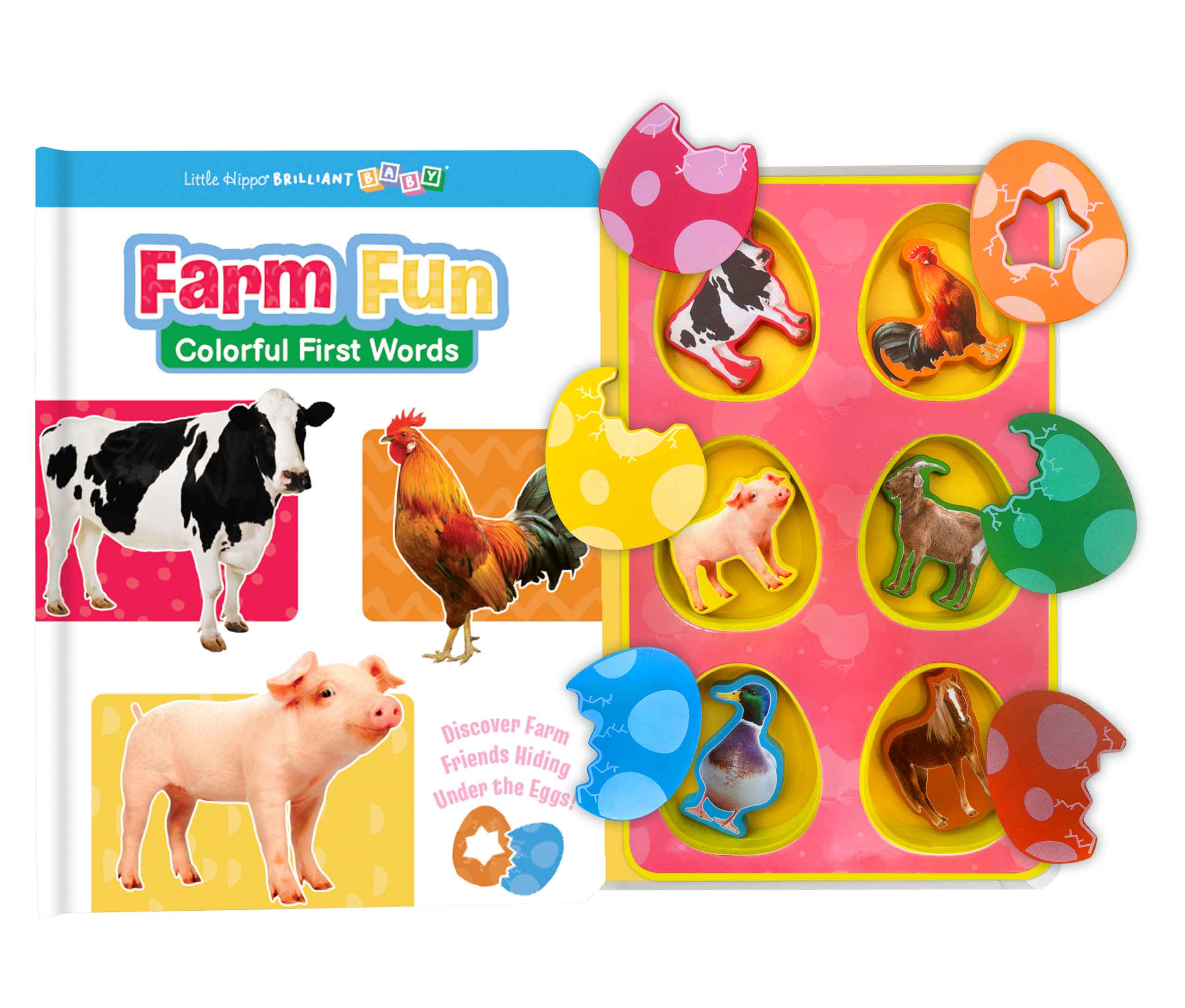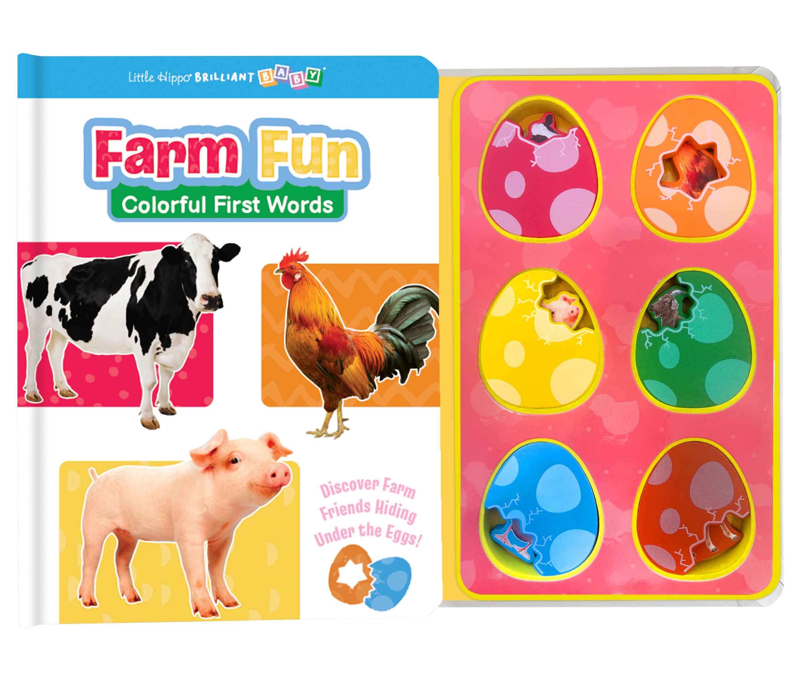 Join the colorful adventure in this Brilliant Baby® Farm Colors book! Each spread introduces a little chick with a favorite thing and fun rhyming descriptions. Children are invited to find three objects of the same color on the page and find the objects under the eggs. Real photography helps promote word and picture recognition. This engaging and interactive book helps little ones learn colors while enjoying a playful farm-themed story.