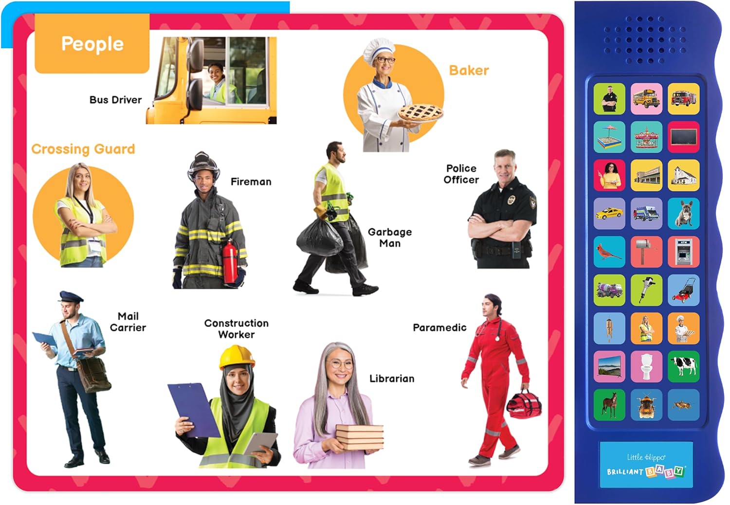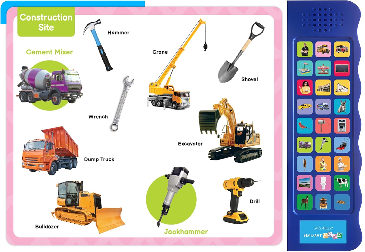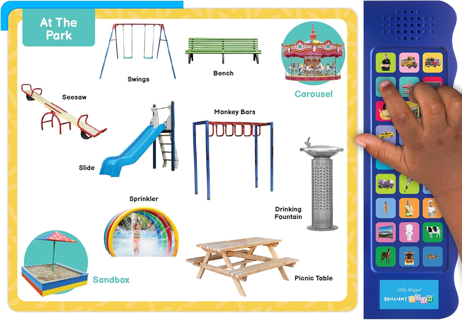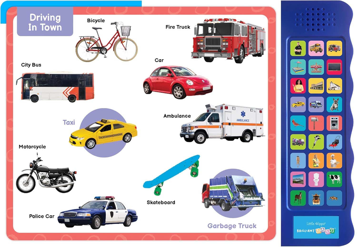 Little ones can learn what’s around town by sight and sound with our Brilliant Baby® Sounds series. Press the button to learn new words and their sounds, as well as the name of one of the objects on the page. Real photographs of various objects promote word and picture recognition.