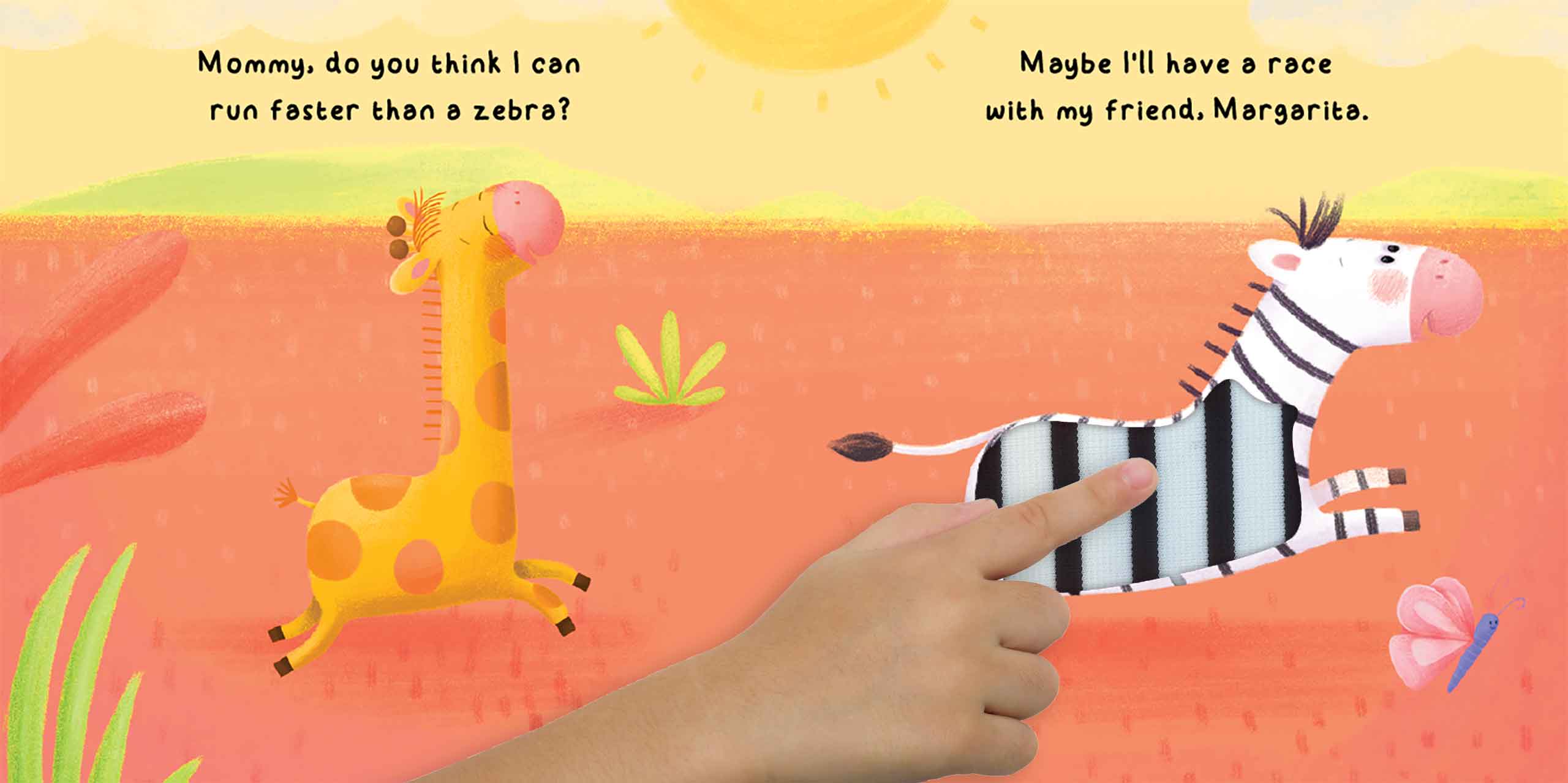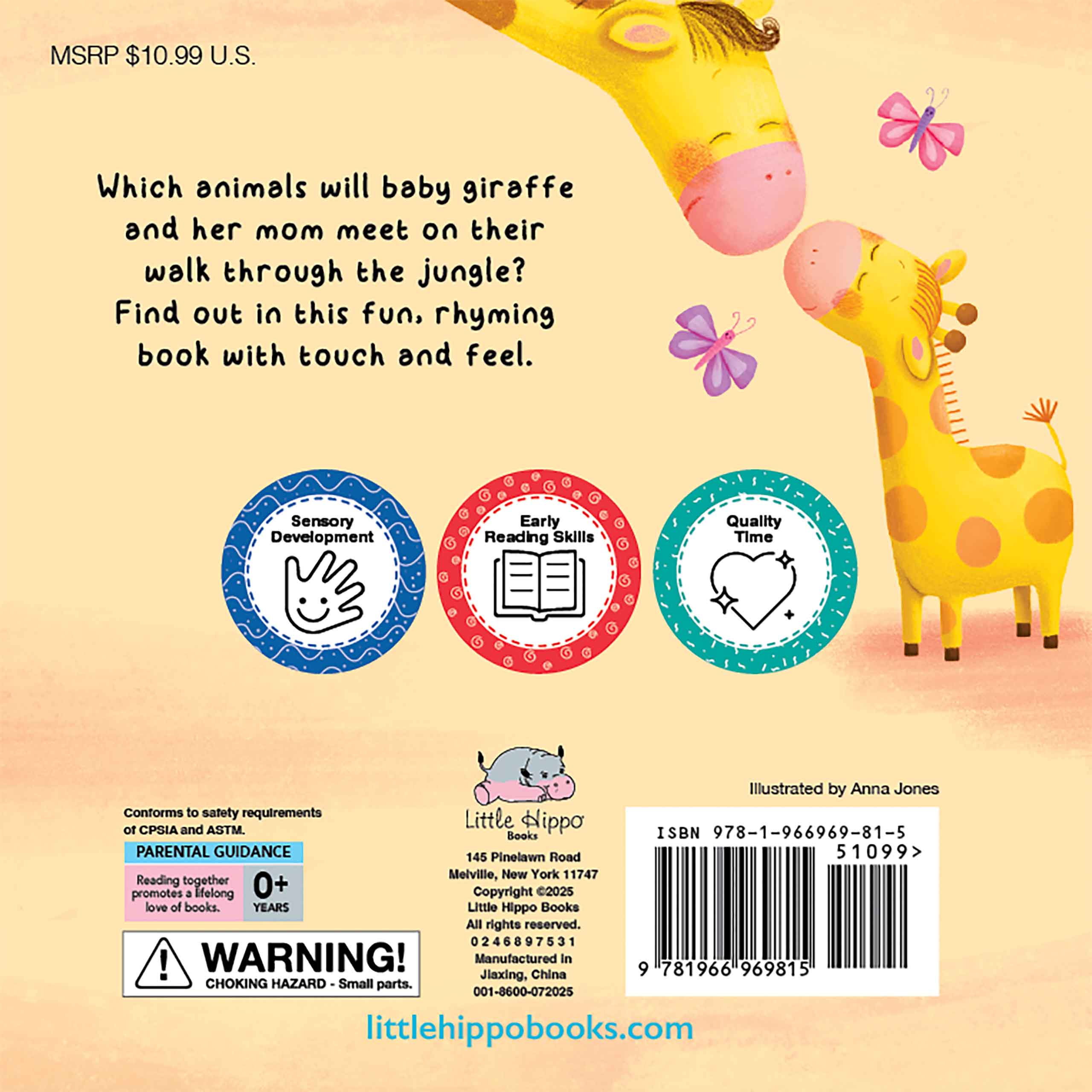 Which animals will baby giraffe and her mom meet on their walk through the jungle? Find out in this fun, rhyming book. Children will have fun reading about the bond between baby giraffe and mommy giraffe while exploring various sensory touch-and-feel elements.