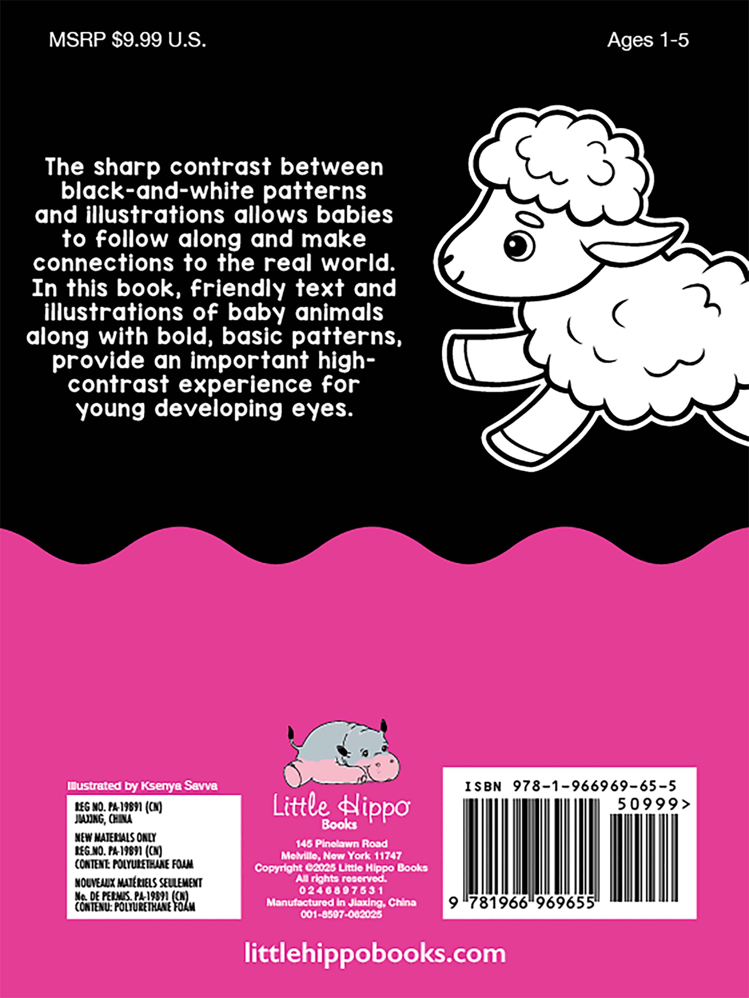 The sharp contrast between black-and-white patterns and illustrations allows babies to follow along and make connections to the real world. In this book, friendly text and illustrations of baby animals along with bold, basic patterns, provide an important high-contrast experience for young developing eyes.