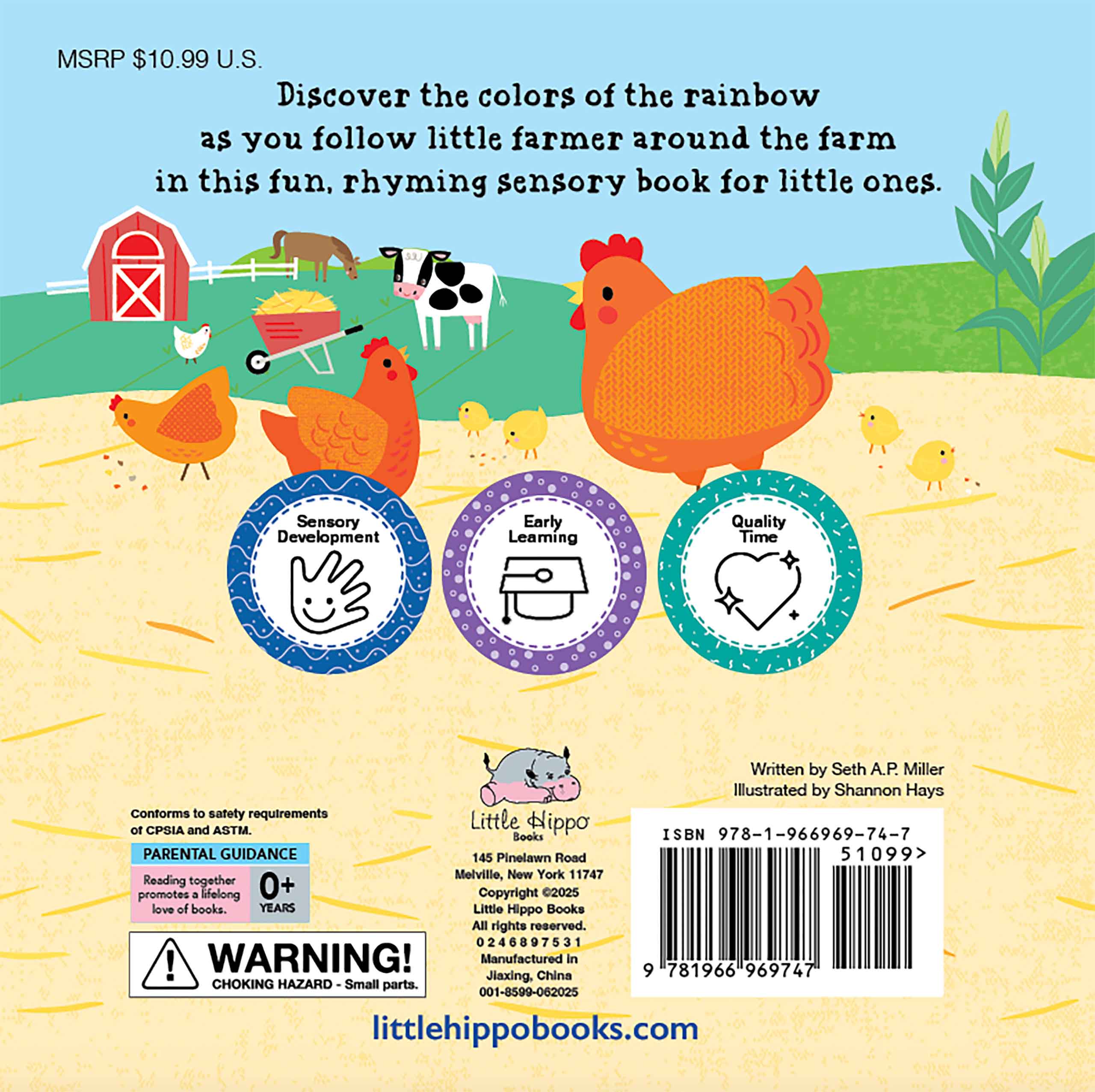 Discover the colors of the rainbow as you follow little farmer around the farm in this fun, rhyming sensory book. Children will have fun reading about a day on the farm and learning colors while exploring various sensory touch-and-feel elements.