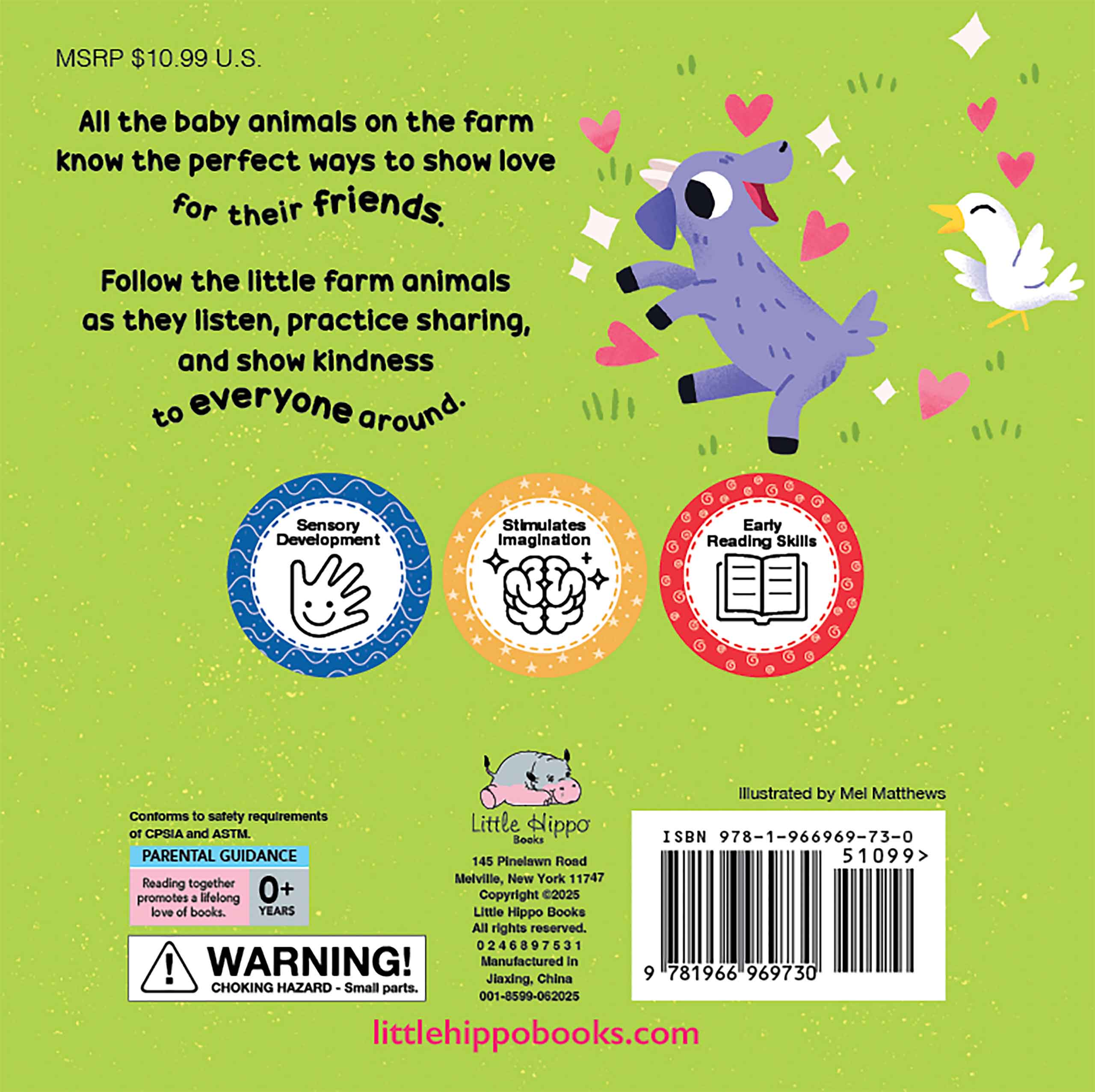 All the baby animals on the farm know the perfect ways to show love for their friends. Follow the little farm animals as they listen, practice sharing, and show kindness to everyone around. Children will have fun reading about the animal friends while exploring various sensory touch-and-feel elements.