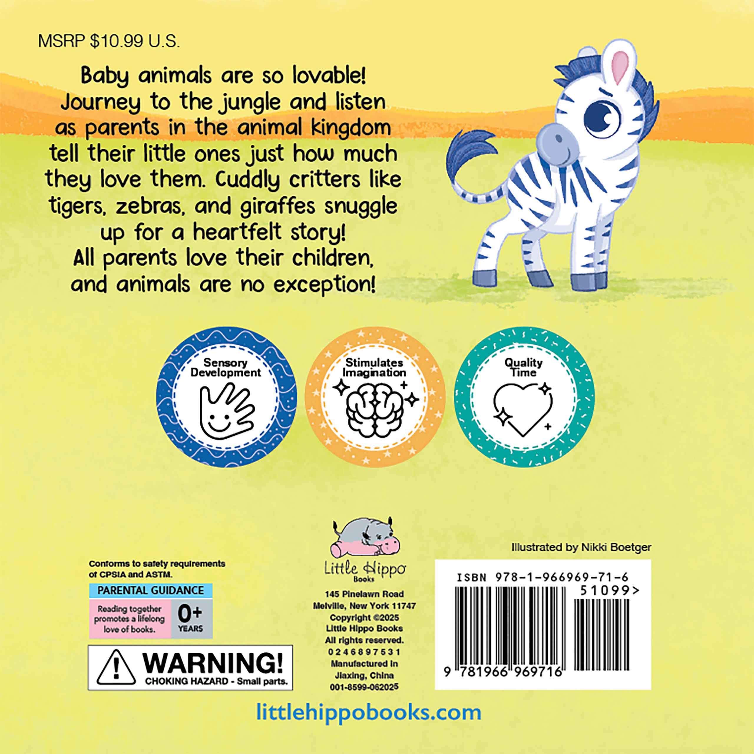 Baby animals are so lovable! Journey to the jungle and listen as parents in the animal kingdom tell their little ones just how much they love them. Cuddly critters like tigers, zebras, and giraffes snuggle up for a heartfelt story! All parents love their children, and animals are no exception! Children will have fun reading about the animals and their parents while exploring various sensory touch-and-feel elements.